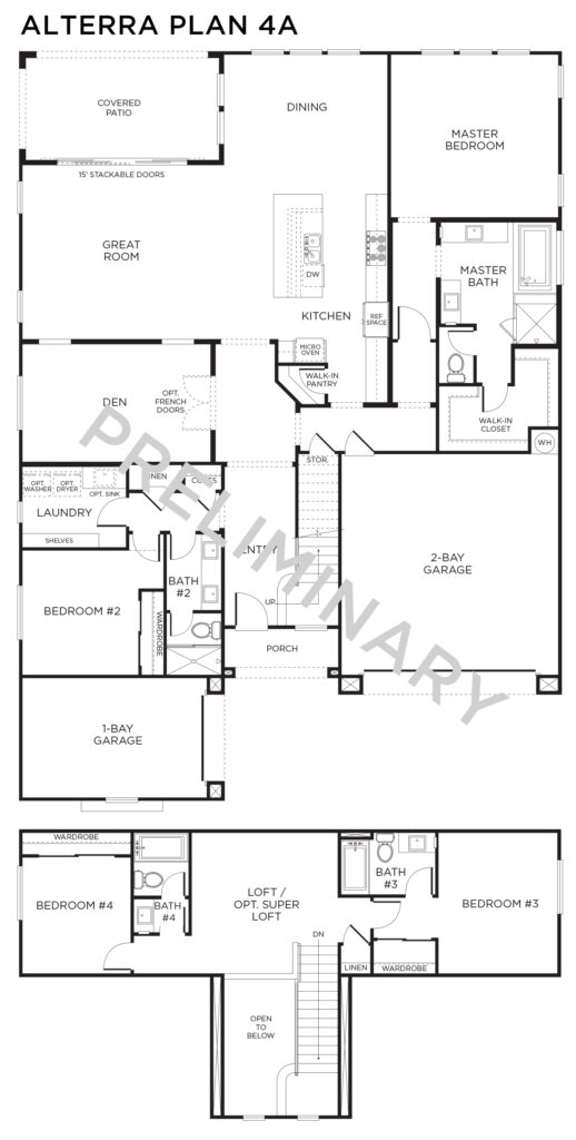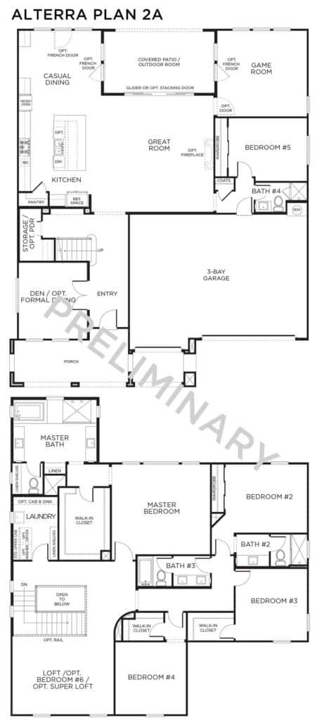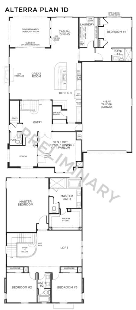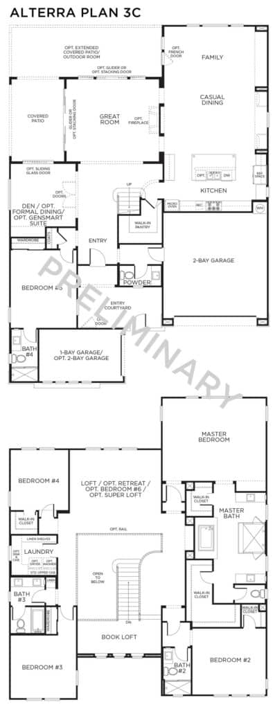 Alterra’s spacious homes range from 3,212 to 4,165 square feet, featuring up to five bedrooms and four bathrooms. Each residence welcomes you with an inviting courtyard entry and can include up to a four-bay garage. The heart of these homes centers around a generous island kitchen that flows seamlessly into family and great room areas, creating the perfect space for both daily living and entertaining.